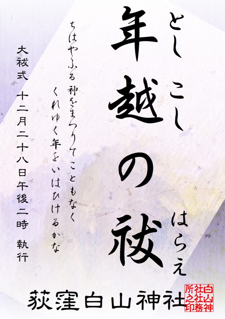 年に2回行われる大祓のうち、十二月に行われるの大祓を『年越しの大祓』と呼びます。(当社では『年越の祓』としています)